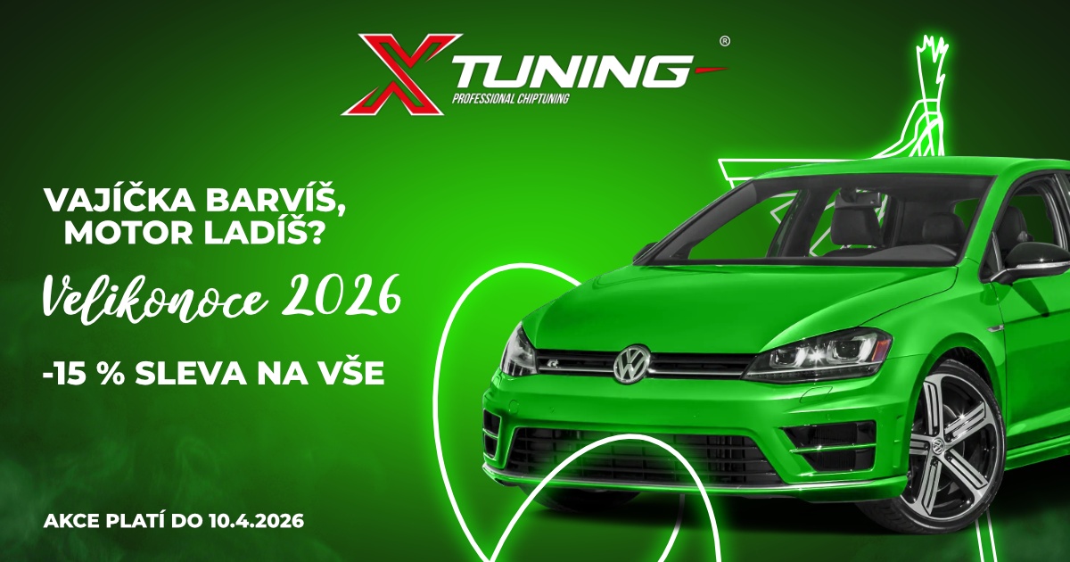 * Sleva -15 % platí pouze na služby objednané do 10. 4. 2026 a realizované nejpozději do 30. 4. 2026. Sleva se nevztahuje na odemčení ECU a čištění DPF filtrů. Slevy nelze kombinovat s jinými akcemi nebo individuálními nabídkami. Uvedené ceny jsou orientační, finální cena se může lišit dle specifikací konkrétního vozu. Společnost XTuning si vyhrazuje právo na změnu podmínek nebo ukončení akce bez předchozího upozornění.